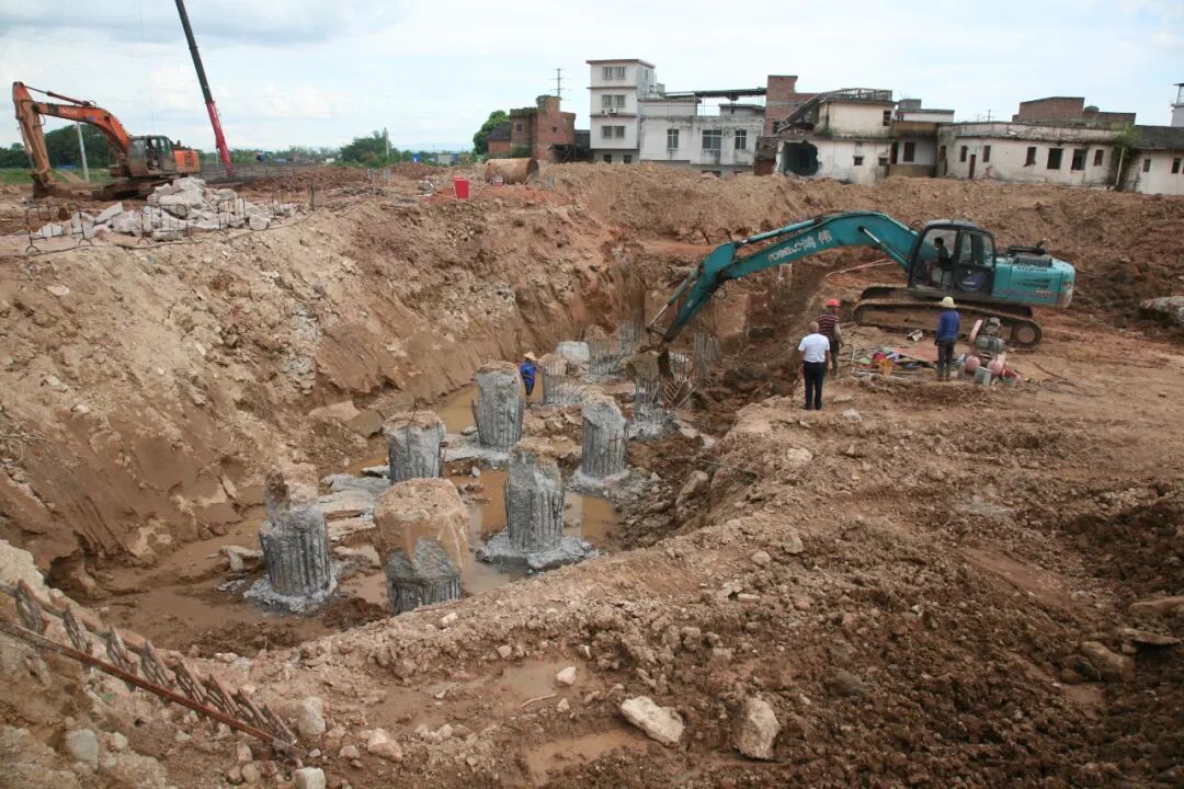7月6日,记者走进刚动工不久的兴宁市锦绣大桥施工现场,看到一片热火朝天的繁忙场景。宁江西边大型吊机正起吊钢筋笼进入已旋挖好的桩孔中,挖掘机辅助工人对0#桥桩进行破桩,混凝土挡土墙施工人员正在绑扎钢筋……